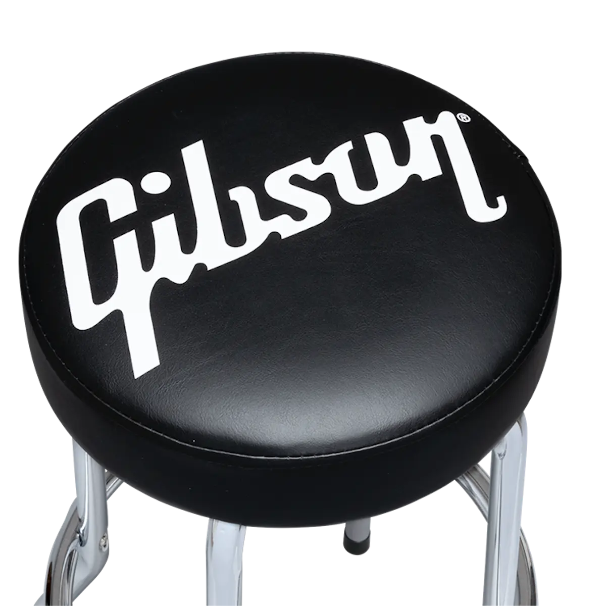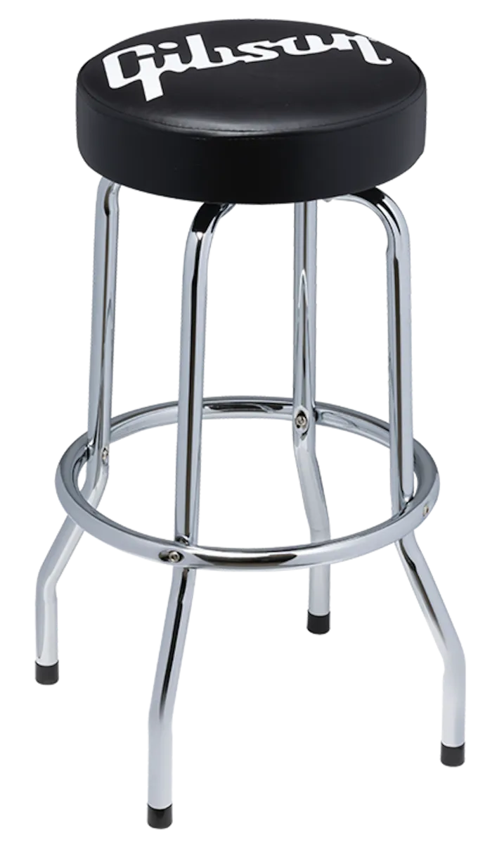 This 30" high playing stool, adorned with the Gibson logo, features a comfortable, padded vinyl seat that swivels through 360 degrees. The classic barstool-style tubular steel legs have a chrome finish, and the stool has a foot ring for added comfort.