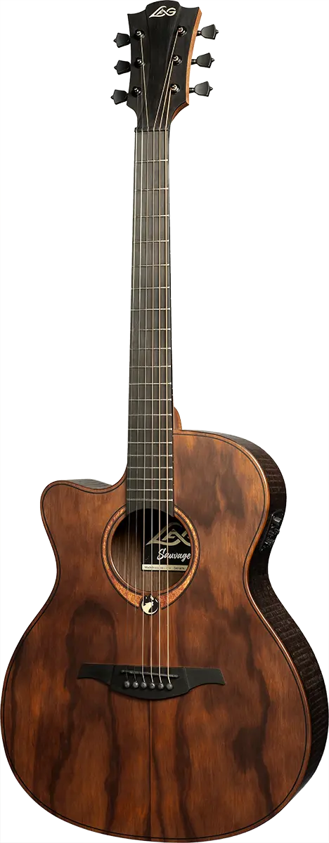 Featuring the iconic Lag headstock design mirrored on the bridge, a rough sawn look on the back and sides, quarter round body bindings, and black machine heads, the Sauvage-ACE-L stands out for its unique aesthetic charm.