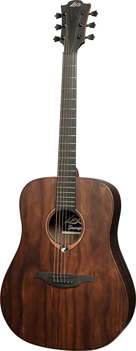 Continuing the Lag tradition of innovation, the Sauvage-D dreadnought steel string guitar is a reflection of artistry and technological advancement. Crafted with eco-friendly certified BrankoWood, it embodies an eco-friendly approach. The Sauvage Series embodies rugged beauty with a rough sawn look, and the rounded back produces a full-bodied tone. The iconic Lag French Headstock design, unique aesthetic features, and modern touches set this guitar apart as a reliable and elegant musical companion.