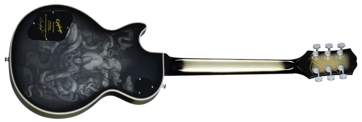 This model from the Adam Jones Les Paul Custom Art Collection features Ernst Fuchs' "ANTI-LAOKOON 1965" on the back. It is also an exceptional instrument for your next musical masterpiece. It has bound mahogany body with a maple cap, a three-piece bound maple neck with an Adam Jones Custom profile, and an ebony fretboard. It is equipped with reverse-mounted Epiphone ProBucker™ Custom humbucker ™ in the neck position and a Seymour Duncan® Distortion in the bridge; both are wired to CTS® potentiometers and Orange Drop® capacitors. A Marquee Back Plate with the artist's name and the name of the artwork is also included. Finished in Antique Silverburst as an homage to Adam's beloved original Silverbust 1979 Gibson® Les Paul Custom, a Protector hardshell case is also included