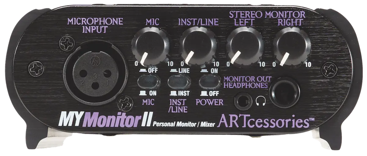 The MYMonitorII allows blending of any microphone source with any stereo source in a convenient personal monitoring solution. The microphone thru provides direct connection to any mixer and will pass phantom power from the board for powering condenser microphones.