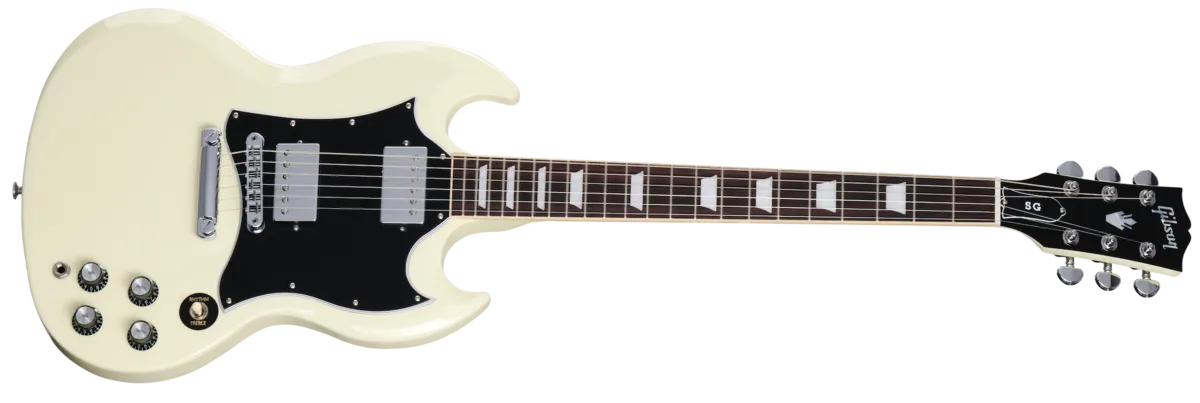 The Gibson SG Standard rocks the classic looks and features associated with the late 60s style SG™ models sought after by many. Now featured as part of the Custom Color Series, it adds exciting new color options to liven up any stage or guitar collection. features a rounded profile mahogany neck, bound rosewood fingerboard, long tenon 19th fret neck joint, and a solid mahogany body that provides the backbone for singing sustain. The 490R and 490T Alnico 2 pickups provide the power to drive. A black, 5-ply, full-face pickguard set this SG Standard apart from others... a truly versatile classic.