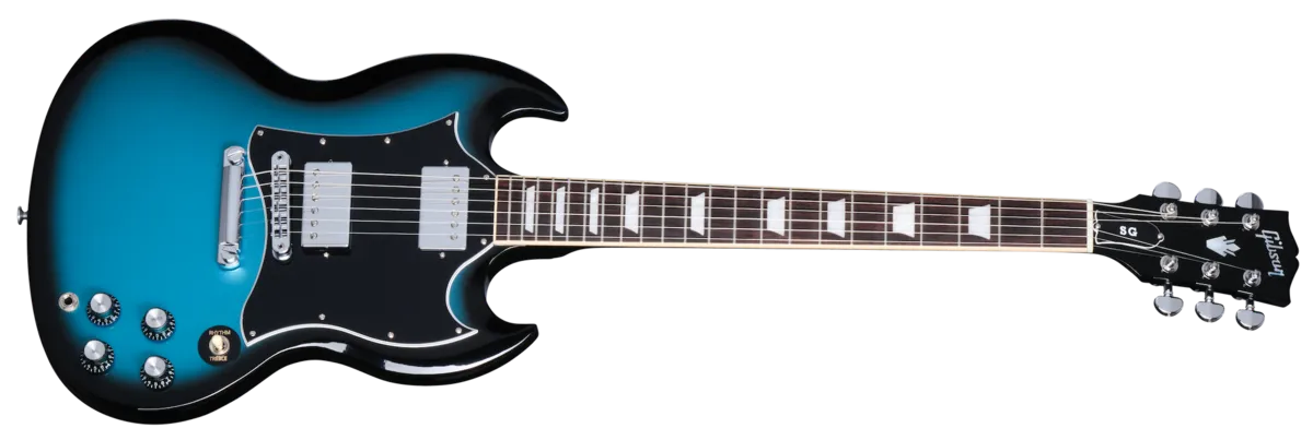 The Gibson SG Standard rocks the classic looks and features associated with the late 60s style SG™ models sought after by many. Now featured as part of the Custom Color Series, it adds exciting new color options to liven up any stage or guitar collection. features a rounded profile mahogany neck, bound rosewood fingerboard, long tenon 19th fret neck joint, and a solid mahogany body that provides the backbone for singing sustain. The 490R and 490T Alnico 2 pickups provide the power to drive. A black, 5-ply, full-face pickguard set this SG Standard apart from others... a truly versatile classic.