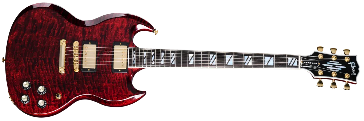 Gibson is excited to announce the return of the SG™ Supreme. With a refreshed feature set, it is bound to overshadow everything else in sight and be one of the most exciting new releases of the year. It features a beautiful AAA-figured maple top on a mahogany body. The mahogany neck has an ebony fretboard with a compound radius, 24 medium jumbo frets, and Super Split Block mother-of-pearl inlays. The headstock is adorned with a striking new mother-of-pearl "Chandelier Inlay" inspired