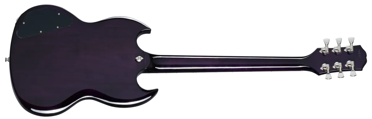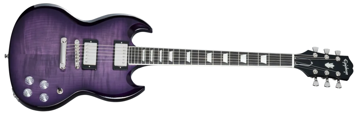 The SG Modern Figured from Epiphone's Inspired by Gibson™ Collection has the classic SG ™M body profile made from mahogany and a 3/4" maple cap with an AAA-figured maple veneer. Powered by a pair of Epiphone's ProBucker ™ humbucker™ pickups with coil-splitting, phase switching, and a treble bleed circuit for a multitude of tones. It also features an ebony fingerboard, asymmetrical Slim Taper ™ neck profile, world-class Grover® Locking Rotomatic® 18:1 ratio tuners, Posi-Lok™ strap buttons, and a Graph Tech® NuBone® nut. A premium gig bag is included.
