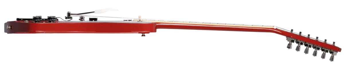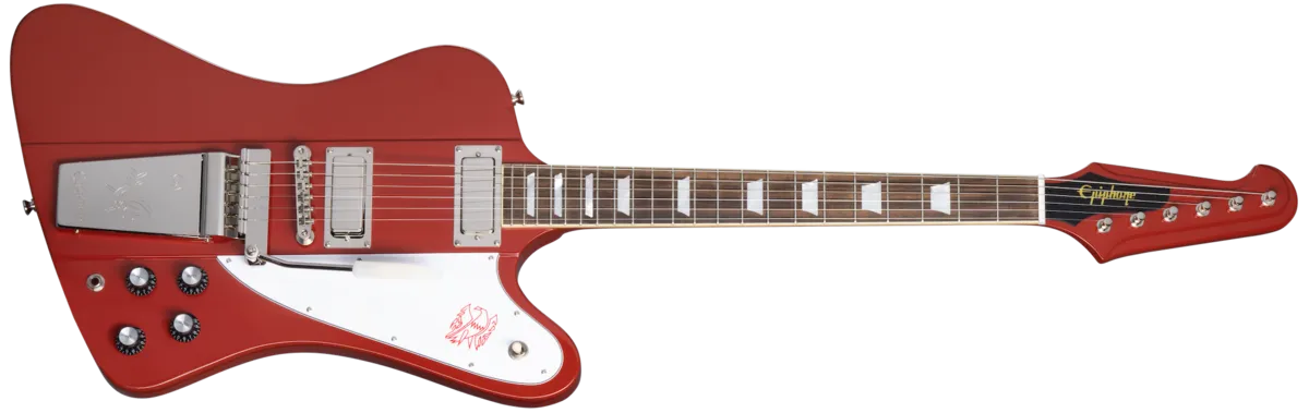 Epiphone and the Gibson Custom Shop have teamed up again to create the Inspired by Gibson Custom 1963 Firebird V - an authentic replica of the guitar designed by legendary automotive designer Ray Dietrich. When it was launched in 1963, the Firebird™ was Gibson's first neck-through-body model, and it went on to be used by players in a wide range of genres, including blues legend Johnny Winter, Keith Richards and Brian Jones of The Rolling Stones, Eric Clapton, and Phil Manzanera of Roxy Music, to name a few. The Epiphone Inspired by Gibson Custom 1963 Firebird V delivers vintage Firebird specifications at an accessible price, including a 9-ply neck-through-body made of mahogany and walnut with mahogany body wings to either side. Kluson® planetary geared "banjo" tuners anchor the strings at the headstock, while an Epiphone ABR bridge and newly redesigned Maestro ™ Vibrola ™ with an engraved Epiphone logo hold things down at the other end. The electronics are also premium and include Gibson USA Firebird mini humbucker™ pickups with Alnico 5 magnets, CTS® potentiometers, Mallory ™ capacitors, and a Switchcraft® 3-way pickup selector toggle switch and 1/4" output jack, giving this remarkable recreation not only the look but also the sound of a classic Firebird V. An Epiphone Inspired by Gibson Custom hardshell case is also included.
