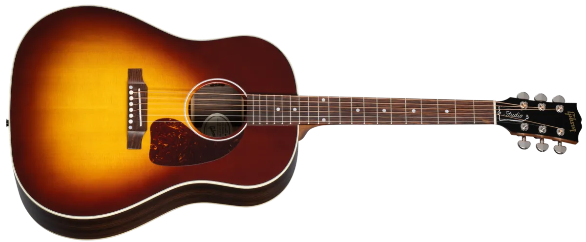 Turn heads with the J-45 ™ Studio Rosewood. Hand-built using solid rosewood back and sides and a solid Sitka spruce top, this updated J-45 Studio features a traditional body depth for warm, rich tone. The Advanced Response profile utile neck ensures smooth, easy playability. Available in Satin Natural and Satin Rosewood Burst finishes, the J-45 Studio Rosewood has an L.R. Baggs ™ Element Bronze active under-saddle piezo pickup for studio-quality plug-and-play anywhere. Packaged in an included hardshell case for portability, this J-45 Studio Rosewood is ready for the studio and the stage.