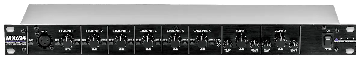 The ART MX624 may be used on stage, in the studio, or for permanent install applications including conference rooms, corporate boardrooms, churches, restaurants, small clubs, health clubs and more. A built-in power supply and single high 19-inch rack mount format allows for easy installation and reliable long-term operation.