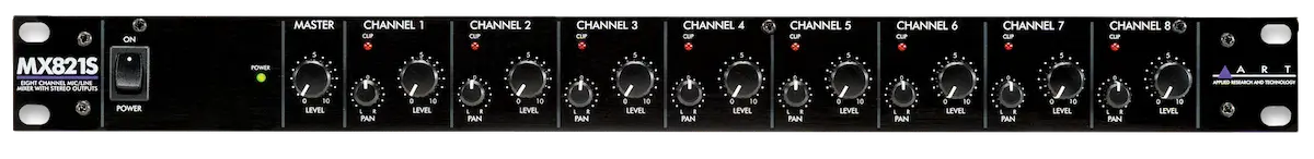 The ART MX821S may be used on stage, in the studio, or for permanent install applications including conference rooms, corporate boardrooms, churches, restaurants, small clubs, health clubs and more. A built-in power supply and single high 19-inch rack mount format allows for easy installation and reliable long-term operation.