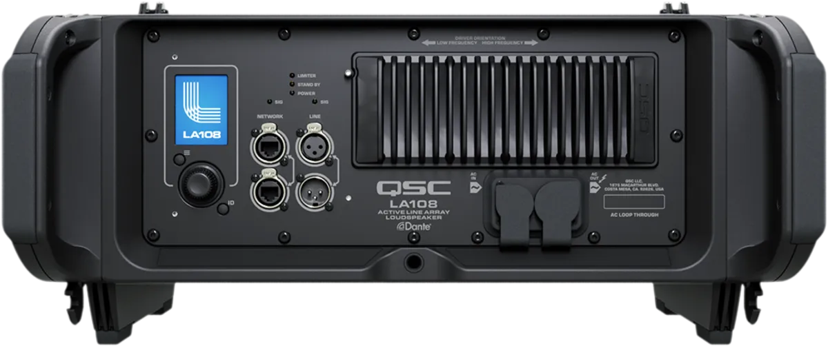 Deployed using dedicated array frame, ground-stacked (array frame combined with optional sub-stack adapters), or mounted using loudspeaker stand/pole, the LA108 loudspeaker also features daisy-chain connections for analog, digital audio and AC power (PowerCON TRUE1).