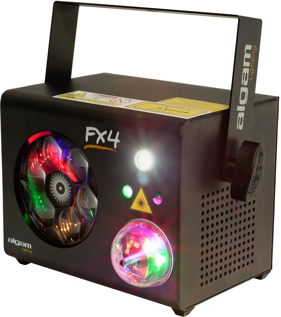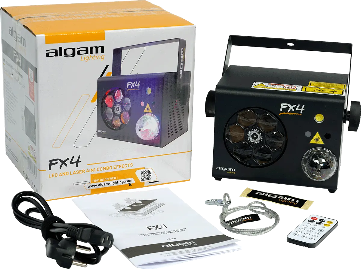 The FX-4 by Algam Lighting is a versatile 4-in-1 light system designed to instantly switch the mood to "Party Mode" in a heartbeat to any event. Despite its compact size and affordability, this all-in-one lighting system packs a punch. features a 6x3W RGB LED gobo wheel that projects various light patterns onto the dancefloor, as well as a 3x3W Magic Ball that diffuses sparkling light effects for a warm and festive ambiance. In addition, the FX-4 includes a multipoint red/green laser that projects multiple beams throughout the room and a stroboscope effect that offers a wide range of dynamic effects. The FX-4 is easy to use, thanks to its automatic mode and music detection mode, which eliminates the need for tedious programming. However, advanced users can take advantage of the 14 DMX channels available to fine-tune the control of this feature-rich combo.