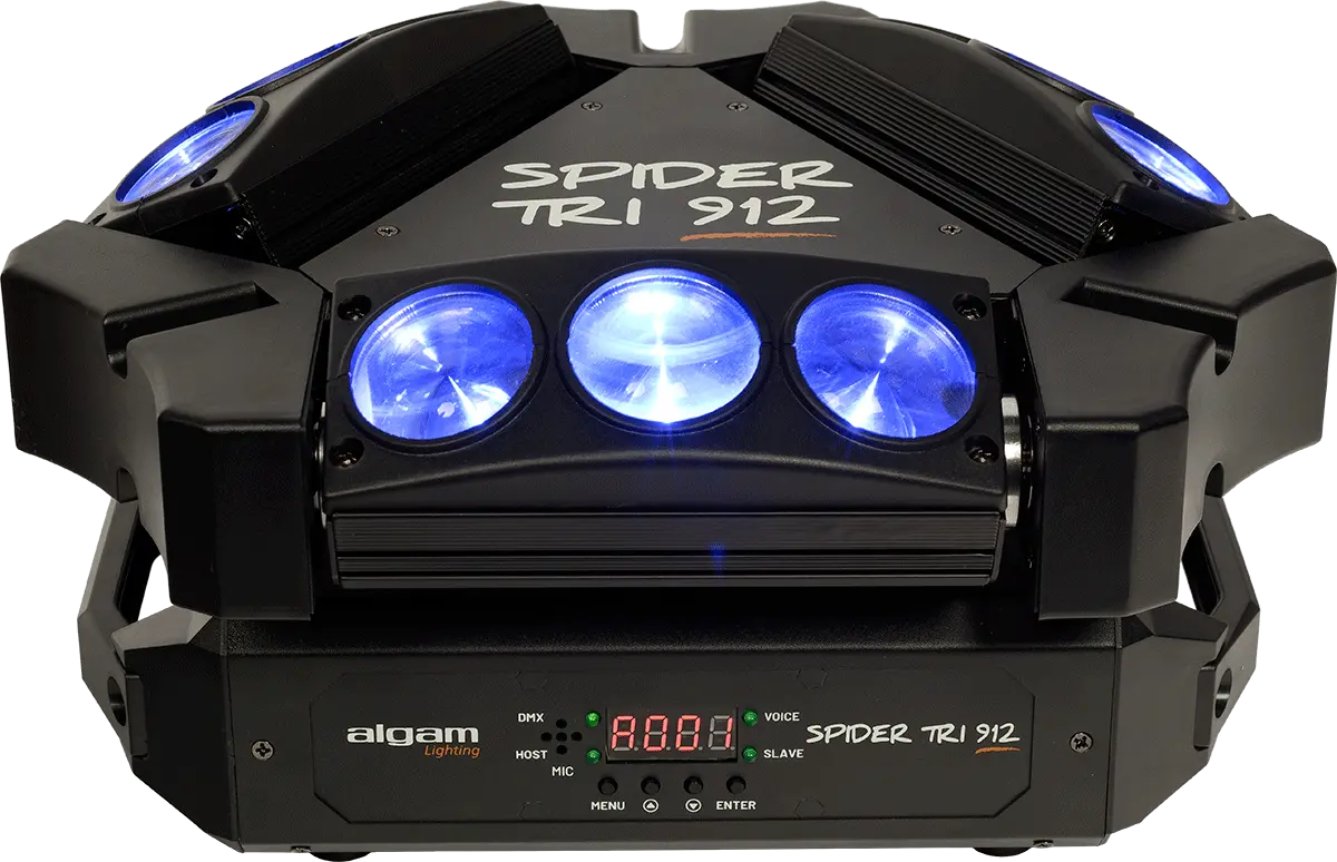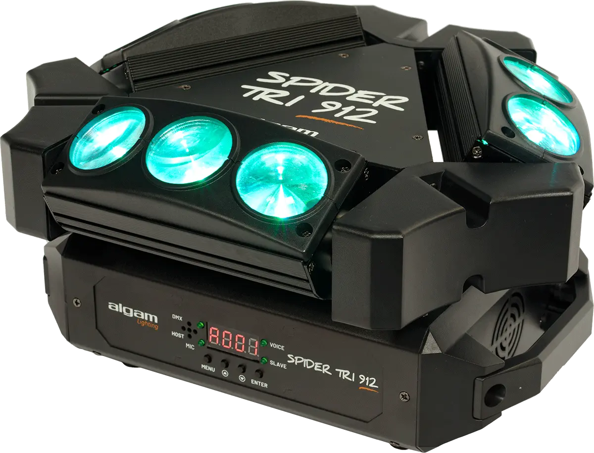The SPIDER TRI 912 is the ideal dynamic LED lighting system suitable for discos, concerts, and private events. It is easy to install and can be set up in various ways, such as being placed on the floor or suspended upside down. The system consists of three motorized mini-bars that can be adjusted in tilt and each contains three independently adjustable 12W RGBW LEDs. The three mini-bars are cleverly arranged in a triangle shape and are mounted on a motorized axis, enabling quick 360° rotation and impressive beam sweeps, creating a vibrant atmosphere on the dance floor. The lighting system offers built-in automatic and music detection modes for users who prefer a quick setup without having to make tedious adjustments. Additionally, more advanced users can utilize the DMX mode to program their light show precisely.