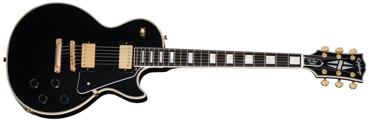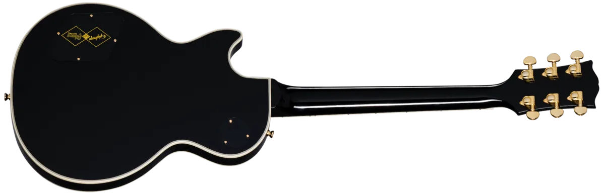 As part of the ongoing collaboration with Gibson TM Custom, Epiphone is proud to introduce the flagship Les Paul™ Custom to the Inspired by Gibson Custom lineup. Replete with all of the classy "tuxedo" appointments that the model is known for, this beautiful guitar has a one-piece mahogany neck with a 50s Rounded C profile, an ebony fretboard, and mother-of-pearl block fretboard inlays. T here are also mother-of-pearl split diamond and Epiphone logo headstock inlays on the Gibson-style "open book" headstock. Gold hardware, including Grover® Rotomatic® 18:1 gear ratio tuners, gives it even more visual appeal. The solid mahogany body has a maple cap for a touch of added sonic bite, while the Gibson USA 490R and 498T pickups provide tonal sophistication and plenty of muscle to back up all the beauty. They're hand-wired to CTS® potentiometers, a Switchcraft® output jack and pickup select switch, and Mallory ™M capacitors. An Inspired by Gibson Custom double diamond logo is on the back of the headstock, and a black hardshell case with the Inspired by Gibson Custom logo and a goldenrod interior is also included.