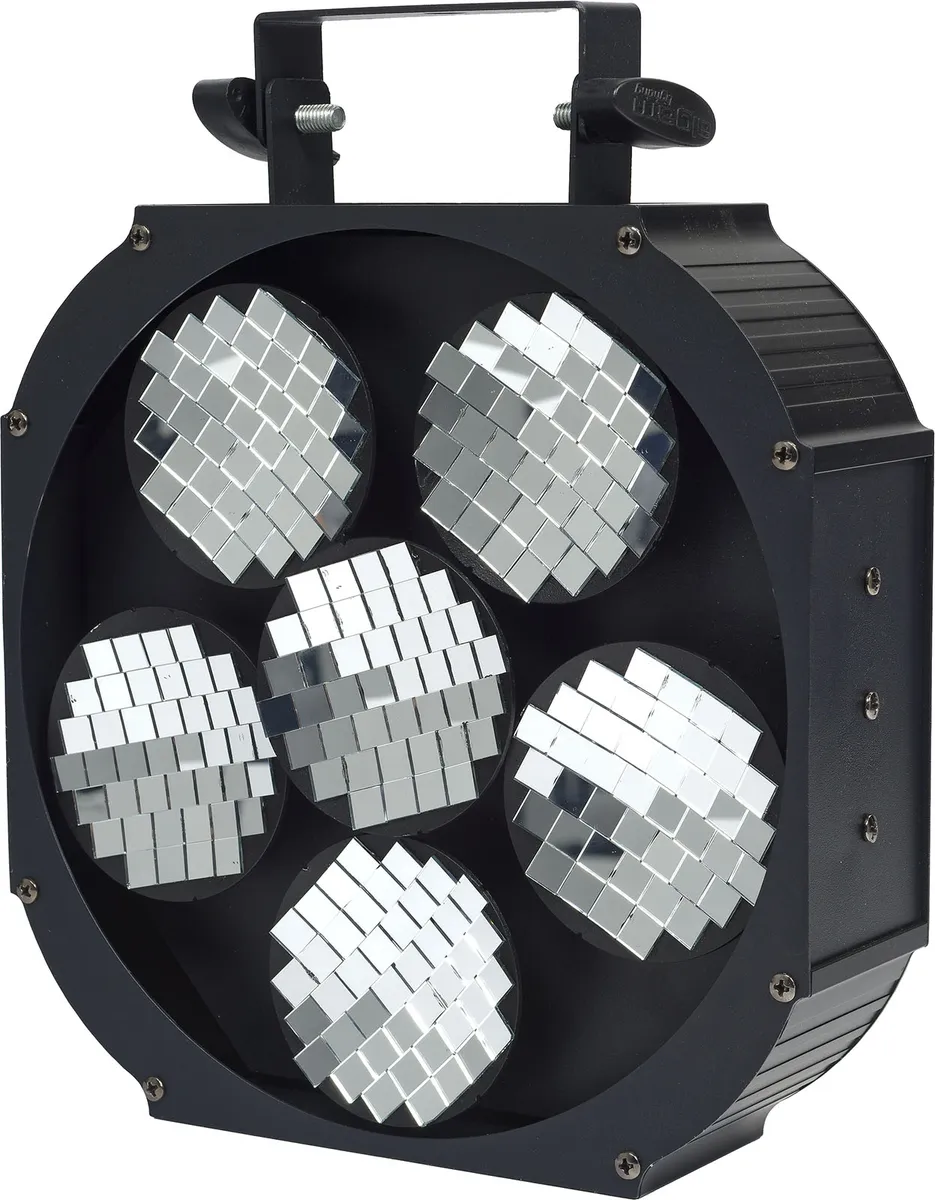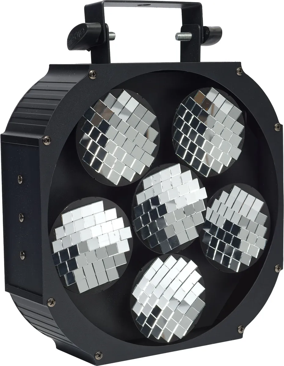 Step back in time to the greatest disco days with the Moving Mirror 6 disco ball effect developed by Algam Lighting! Featuring 6 rotating motorized mirrored discs, this revamped disco ball is perfect for unleashing the dancefloor in a flash. Simply aim a Spot or Beam moving head at the mirrors, activate the Moving Mirror 6's music detection mode and get the party started !A new twist on the disco ball!A must for every disco party and nightclub worthy of the name, the disco ball is certainly the most iconic effect of the 80s! With the Moving Mirror 6, Algam Lighting offers a revamped and revitalized version of this legendary effect. Consisting of 6 motorized, curved rotating discs covered with a mosaic of mirrors, capable of operating at different speeds and in opposite directions, the Moving Mirror 6 is capable of generating an impressive faceted ball effect, with moving patterns criss-crossing in space. Simply aim a sufficiently powerful and concentrated beam of light from a Beam or Spot moving head at the mirrors, and you're ready to party!Unpack, power up, dance!The Moving Mirror 6 has been designed to be ready for use in a matter of moments, thanks to its easy-to-use interface. Choose one of the two automatic modes or activate the music detection mode, point a beam at the mirrors, and you're ready to go! For more advanced users, the Moving Mirror can be precisely controlled via the 9 DMX channels available, allowing independent speed and rotation control over the 6 discs.