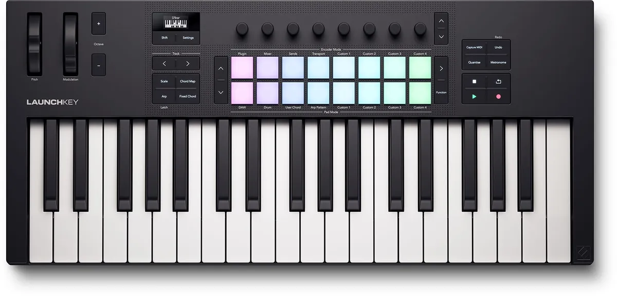 Launchkey 37 is a powerful DAW controller featuring a premium semi-weighted keybed, eight continuous encoders, nine faders, and 16 velocity-sensitive pads for playing drums, instruments, and launching clips. Designed for artists, the 37-key offers powerful DAW integration with a thoughtfully arranged control surface. Play instruments and drums, launch clips and scenes, and gain instant hands-on control over your DAW’s mixer, devices, and effects.