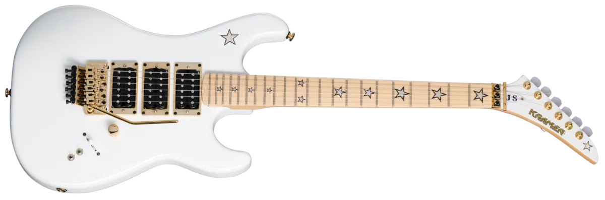 The Kramer Jersey Star is designed for players Who want more - more pickups, more speed, and more in-your-face Kramer attitude! Part of Kramer's Original Collection. the Jersey Star was first released in the 1980s and. over the years, has been one of our most popular models, This updated version features gold hardware, a three-piece maple neck With a satin finish, an elliptical C profile for and Comfort, and a 25_5• scale Iength. The maple fretboard sports 22 jumbo frets and laser-cut mother-of-pearl star inlays. The alder body also features a mother-of-pearl star inlay. lt packs a trio of Kramer USA Neptune humbuckerrv pickups paired With a master volume control. a five-way pickup selector switch, and individual coil tap mini switches for the bridge and middle pickups. The Kramer "pointy" headstOCk alSO has a mother-of-pearl Star inlay, along With a Floyd Rose@ R2 locking nut that, along With the Floyd Rose 1000 Series tremolo, keeps everything solidly in tune, regardless of how wild you get With the wiggle stick acrobatics. A premium gig bag keeps this Star safe and secure. no matter where the road may take you.