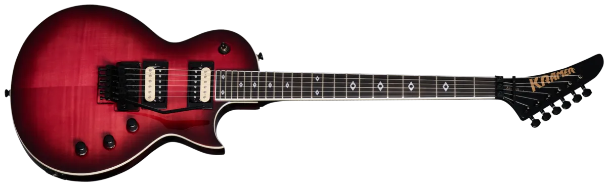 The Kramer Assault started life as the Kramer Custom when it was first released in 2000_ A modern take on the Les PaulTU , it has since become a popular model for hard rock and metal players Who want a lighter and sleeker single cutaway guitar. This newly updated version features a new three-piece thermally-aged maple neck With a satin-finished back. K-Speed SlimTaperrv C profile, and 25.5" scale Iength, while the ebony fretboard is equipped With 24 jumbo frets and decked out With Classic Kramer Diamond Eye inlays_ The body is capped With a AAA flame maple veneer and is packing a pair of Kramer USA Eruption humbucker'V pickups for full-throttled tone and Plenty of attitude. They're wired to individual volume controls and a master tone Control. all of which use CTS@ potentiometers. Of Course, we also included a Floyd Rose@ 1000 series tremolo and R2 locking nut so yOu can divo-bomb any audience into Submission at Will and a premium gig bag to help keep it safe when you're headed out to blow everyone away at your next gig.