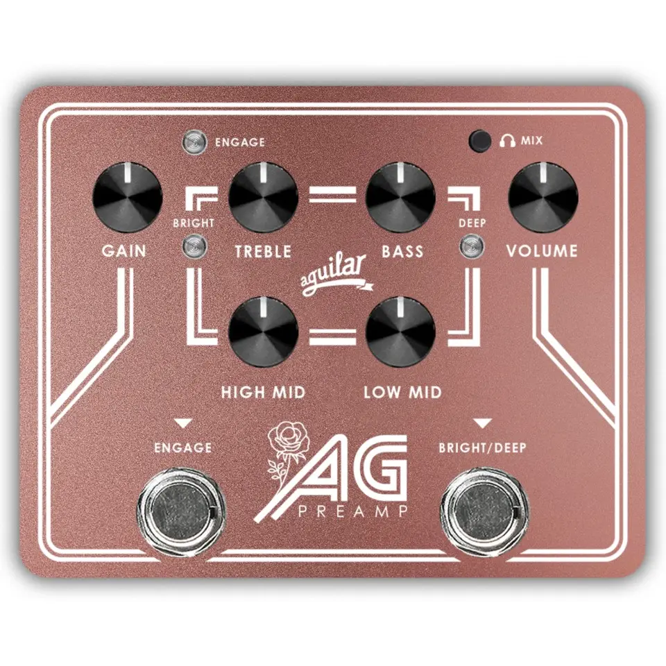Revered for its tight, fast response and wide tonal flexibility, the AG Preamp takes the beloved AG sound and places it in a compact pedal/DI. The AG Preamp features a 4-band EQ and foot-switchable broadband "deep " and "bright" controls for added depth and presence. Its 18-volt operation provides plenty of headroom, ensuring your sound stays clean and transparent. It also features a built-in headphone out and aux in for silent practicing, as well as a balanced DI with pre/post and ground lift controls. This stunning rose gold pedal with unique ribbon and rose graphics is much more than just a limited-edition pedal. Inspired by the journeys and survivors from our team, Aguilar Amplification joins the world in its efforts to raise awareness and funding for breast cancer research kicking off this October. With every purchase of this special AG Preamp/DI pedal, a portion of the proceeds will be donated to The Breast Cancer Research Foundation a non-profit organization committed to achieving prevention and a cure for breast cancer. Available in limited-quantities, this pedal is a collector's dream and a way to support a great cause!