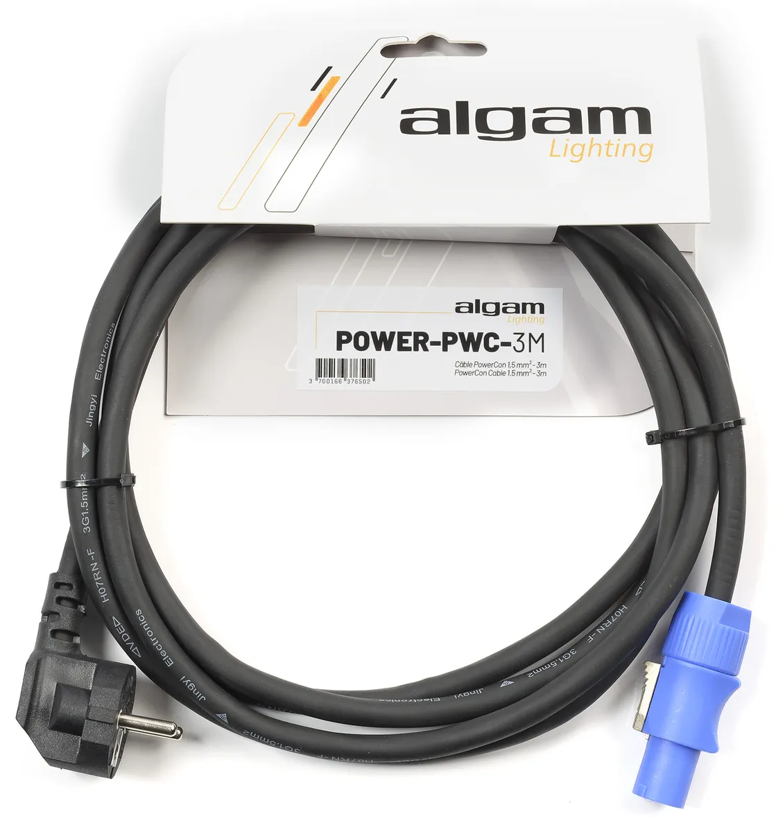 Algam Lighting's 3m PowerCon power cable is designed to safely power professional lighting machines equipped with a locking PowerCon plug. The angled design of the mains plug makes it easy to connect to a wall socket or power strip.The ideal power cable for professional light machinesThe PowerCon system is a power supply standard found on many professional light machines. This type of lockable connector offers a robust and reliable connection, reducing the risk of unwanted disconnections and incidents. Its 3 x 1.5 mm² conductors guarantee a safe power supply for all your light machines.