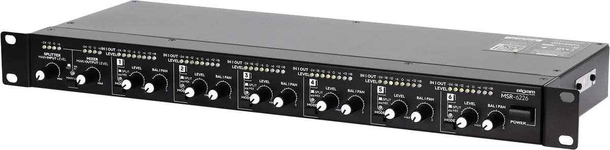 In addition to its mixing capabilities, the MSR 6226 excels as an audio signal splitter. Each of the six input/output channels can be switched independently between mixer and splitter mode, allowing distribution of a single signal to multiple destinations via the XLR outputs of each channel. This makes the MSR 6226 perfect for applications such as zone distribution in commercial audio systems, such as superstores, or submixing in live PA setups.