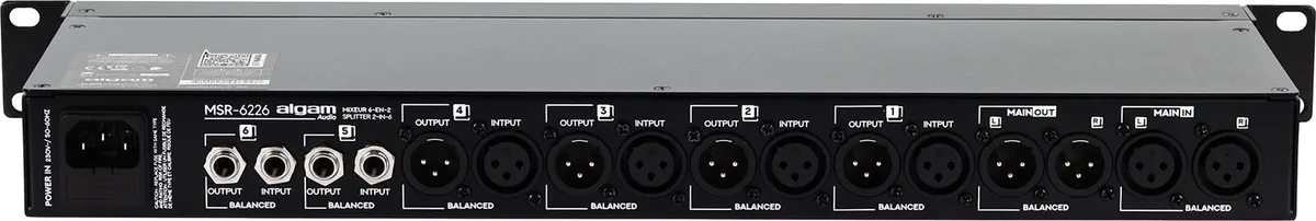 The rear panel of the MSR 6226 offers full connectivity, with XLR input and output on channels 1 to 4, and balanced jack input and output on channels 5 and 6. Channel I/O is complemented by a Main LR input for splitter applications, allowing a signal to be sent to the individual XLR outputs of each channel, while the Main LR output is dedicated to summing and sending a stereo signal to a single destination.