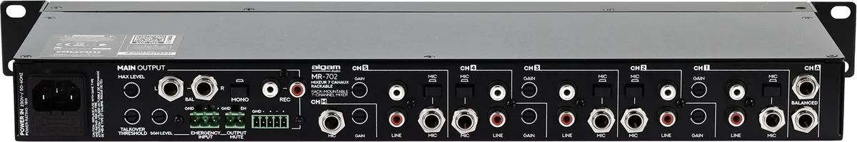 Beyond its basic mixing capabilities, the MR-702 integrates advanced features that make it a powerful and customizable tool. The emergency signal input, in Euroblock format, ensures that priority announcements will always be audible, overriding all other audio sources when a signal is detected on this input. The M channel microphone priority, with its adjustable talkover via the front and rear panels, allows speech to take precedence over music, which is useful for delivering a message without completely interrupting the music.
