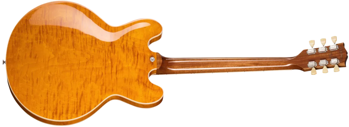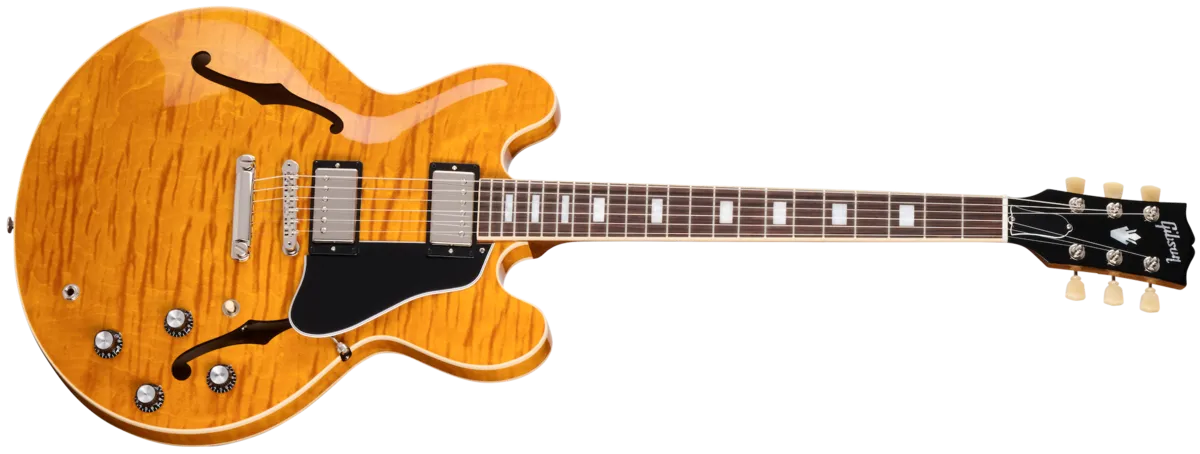 The Gibson ES-335 Figured is the perfect blend of form and function. Crafted with a maple centerblock and quarter-sawn Adirondack spruce bracing, players will be impressed by the lightweight feel and expanded range of tonal capabilities. Equipped with high-end appointments like our hand-wired control assembly with Orange Drop® capacitors, Gibson's new Calibrated T-Type humbucking pickups, Vintage Deluxe style tuners, and lightweight aluminum ABR-1 bridge and Stop Bar tailpiece anchored with steel thumbwheels and studs. The AAA figured maple is set off by beautiful Custom Color Series gloss finishes including Blood Moon Burst, Deep Ocean Burst, and Honey Amber.