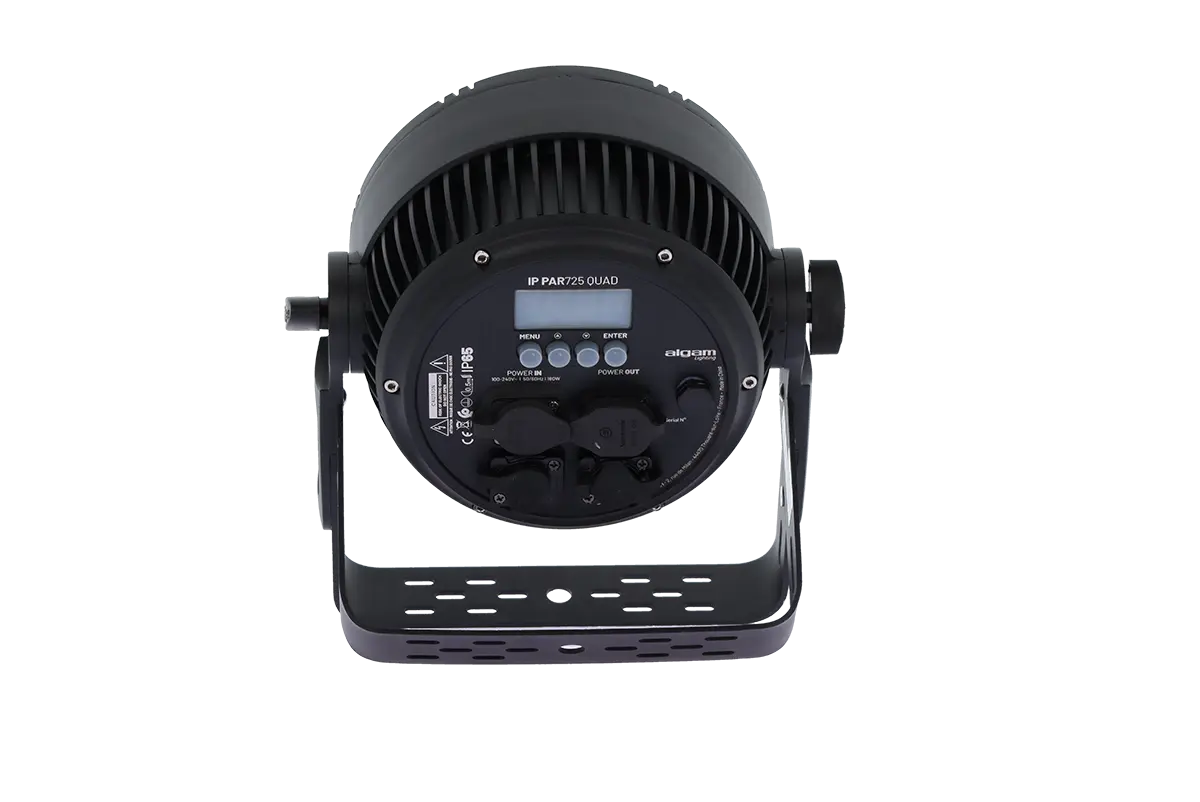 With IP65 protection, the IP PAR 725 QUAD is equipped with sealed connectors on the machine, and comes with PowerCon and DMX IP cables to prevent any infiltration of the connectors. A full-featured fixture, it can operate in automatic mode, react to ambient music, be controlled via a DMX controller or a master device, and can also be parameterized via the keypad on the back.