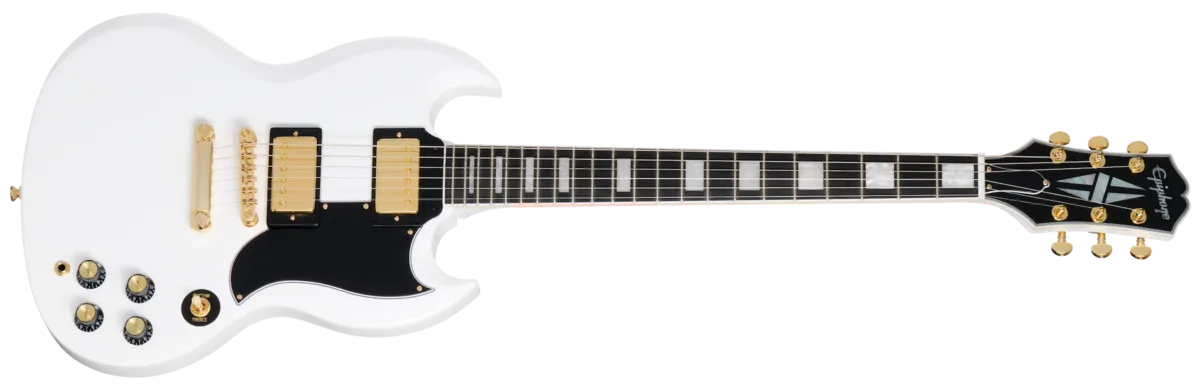 Part of the Inspired by Gibson Collection, the Epiphone SG Custom has been refreshed and is better than ever. The legendary SG™ has long been a favorite of musicians across genres. Like the Custom version of the Les Paul, which Les himself envisioned as a fancier, "tuxedo" version of his legendary solidbody model, the SG Custom also features the premium appointments that can be found on all Custom models. The Epiphone SG Custom has a contoured, double-cutaway mahogany body that delivers exceptional access to all 22 frets. The glued-in mahogany neck adds to the model's renowned sustain. The neck has a 1960 Slim Taper C profile that isn't quite as thin as some Slim Taper neck profiles but is still fast and comfortable to play. The neck is capped with a bound ebony fretboard equipped with 22 medium jumbo frets and is adorned with Custom pearloid block inlays. The 12" fretboard radius is equally comfortable and well suited for first-position chording and for string bends further up the neck without the risk of your bends fretting out. The Epiphone SG Custom is outfitted with gold hardware throughout, right down to the gold inserts on the black Top Hat control knobs. The bound headstock has Grover® Mini Rotomatic® tuning machines and is adorned with the Epiphone logo and Custom Split Diamond inlay, both in mother of pearl. The Grover tuners, Graph Tech ™ nut, and the fully adjustable Epiphone Lock Tone ™ Tune-O-Matic™M bridge and Stop Bar tailpiece all work together to keep the tuning stability and intonation on point. The Epiphone SG Custom is equipped with a pair of Epiphone ProBucker™ Custom humbucking pickups that deliver all of the vintage-approved SG tones you expect. Each pickup is wired to its own individual volume and tone control, along with a three-way toggle pickup selector switch, which lets you use either pickup alone or combine them in whatever ratio suits your mood and the musical moment. The Epiphone SG Custom is a refined and elegant model in formal attire that is well-suited for any occasion. Its stunning looks will turn heads, and its rich sound will impress players and fans alike. It comes complete with a premium gig bag to help keep it safe whether you're traveling to your next open mic night jam session, wedding reception, or club gig.