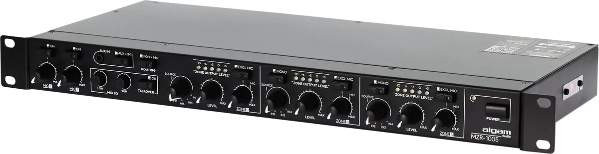 The MZR-1005 is an audio mixer/zoner designed to provide flexible, efficient sound management in public spaces such as bars, restaurants and shopping centers. With its 4 stereo RCA inputs and two microphone inputs with 2-band equalization and configurable talkover, you can mix a multitude of audio sources, from CD players to mixing consoles or smartphones. The MZR-1005 also features a 3.5 mm auxiliary input on the front panel, routing the signal to channel 1 by pressing the AUX>IN1 button.